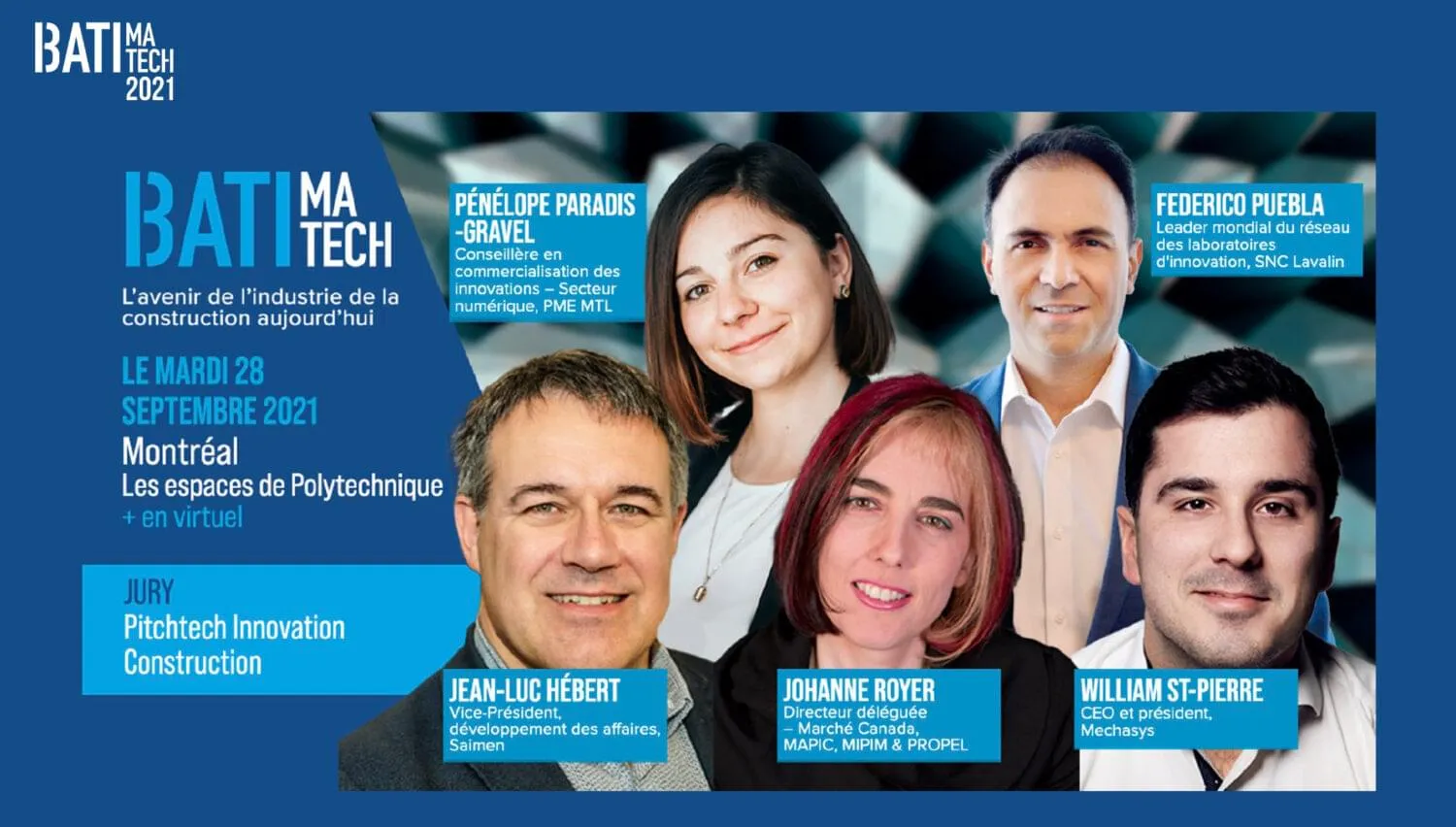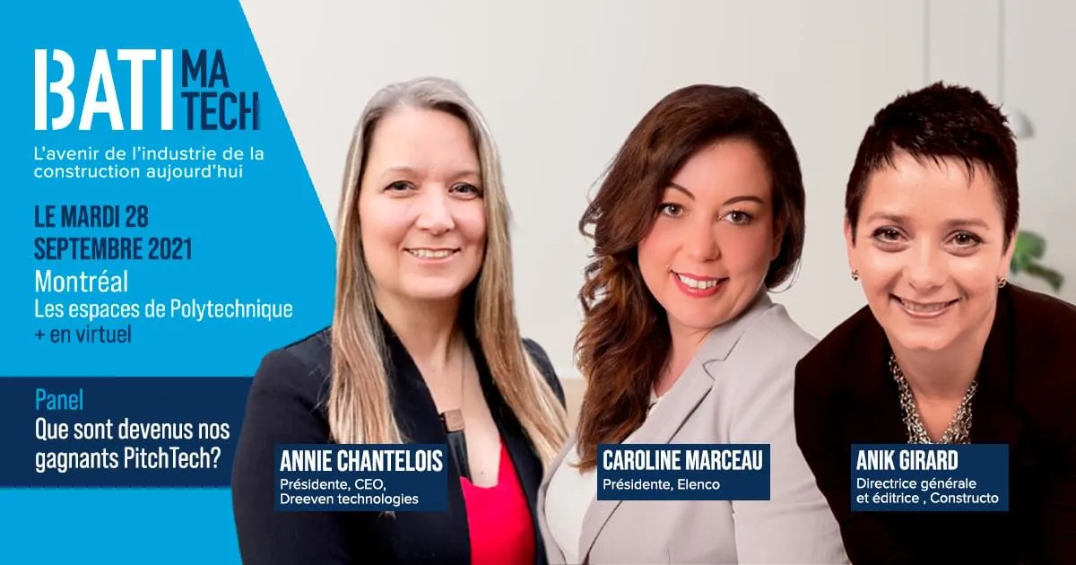 Le 28 septembre dernier, nous avons eu le plaisir d’accueillir notre 6ème édition de Batimatech. Cette version hybride se déroulait simultanément aux Espaces Polytechnique à Montréal, et sur notre plateforme de conférences et de réseautage.